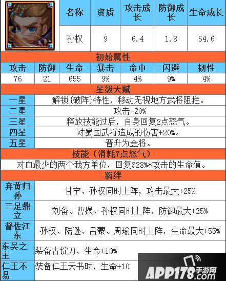三国笑传孙权怎么培养吴国武将属性一览,一般判断一个武将的价值在两个方面,一个是他的星级属性还有一个是搭配,资质高的英雄初始伤害就比普通高一大截,缘分伤害加成足够的高,但是激活难度也大,还有技能,是单体输出还是全体伤害,最后就是技能特征,辅助系的还是伤害系的,喜欢孙权的玩家一起看下表。