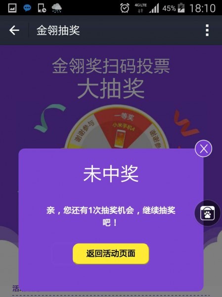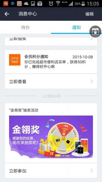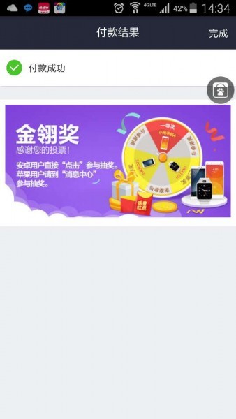 3.投票完成后出现付款成功页面,安卓用户点击下方金翎奖广告图即可跳转抽奖页面;iOS用户点击支付宝菜单栏“朋友”—“消息中心”—“通知”即可找到抽奖页面入口。