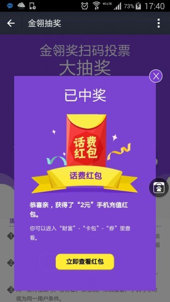获得虚拟奖品如“话费红包”,可按照提示进入“财富”—“卡包”—“券”查看;