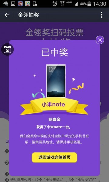 获得实物奖品如“小米note”,工作人员将会尽快与获奖支付宝账户绑定的手机号联系,请获奖用户保持手机畅通。