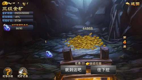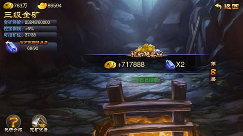 玩家每一次的挖矿都会获得铜钱,每一次选择“往下挖”都将可能会让下次的挖矿奖励提高至普通奖励(1.5倍),又或是幸运奖励(2倍)。到次数用完,选择“就到这吧”就可以直接获得奖励,也可以继续往下挖,听说继续挖能够获得的幸运奖励机会会更高。最终满载而归就可以获得所有的奖励。