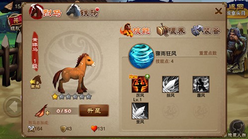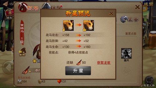 在成功领取战马后可通过喂养的方式来提升战马的等级,每种类别的战马所需要的食物也各不同。由于战马需要升阶至成年马匹才能乘骑作战,所以提升星阶就很关键,在收集到相对应的材料时,玩家需通过试练挑战才能提升战马星级,而当达到满星时就可与征服美女相同进行战马征服,让其成为你的作战脚力。