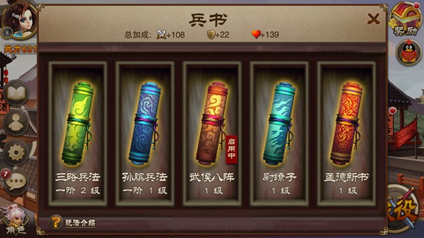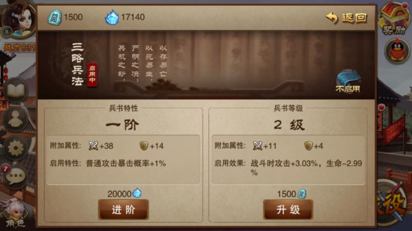 另一种则是兵书升级,兵书本身也都会有属性的加成,与特性相同还会有一额外的BUFF附体效果。玩家可通过阅历的消耗对兵书进行升级。目前在《三国之刃》中,阅历可以通过副本、演武试练、狩猎以及签到等奖励中获取,在人物满级后所获得的经验也会自动转化为阅历。