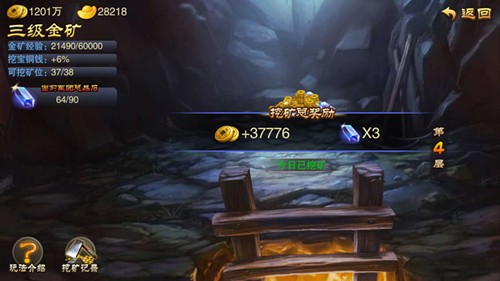 在后山寻宝中,玩家可以通过点击挖矿来获得铜钱的奖励,并可以点击“往下挖”让铜钱可能以多倍的数量进行提升。这里也是赚取铜钱的方式,直至玩家将所有挖矿次数用完为止。在挖矿过程中,玩家还可能会挖出晶石,在军团成员共同收集到90个晶石时,所有军团成员还会额外获得一笔铜钱奖励。与博饼相同,在挖矿结束之后都会增加金矿的经验,并提升金矿的等级以获得更多的铜钱。