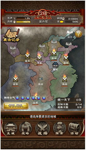 “占领城池”是《三国志荣耀》最具特色的PVP玩法。游戏中的每个城池都有“耐久度”,玩家与驻扎在该州的其他玩家进行战斗并获得胜利,就能降低其城池的耐久度,直至占领城池;占领所有城池后,玩家将获得丰厚回报。该玩法支持重复体验,玩家可尝试不同的武将兵种搭配、以不同策略完成统一天下的伟业。