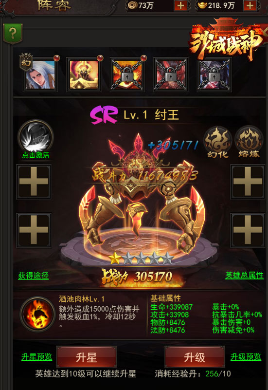 玩家可以消耗经验丹给幻化的英雄升级,英雄到达10级可继续升星。升级能够提高英雄的生命、攻击、物防与法防,而升星能够提升英雄技能的属性加成。