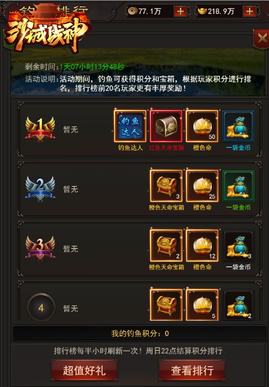 钓鱼活动排行榜每半小时刷新,周日22点结算,奖励通过邮件发放,每天钓鱼达到一定次数后,可开启自动钓鱼,活动结算前3分钟,不能自动钓鱼。