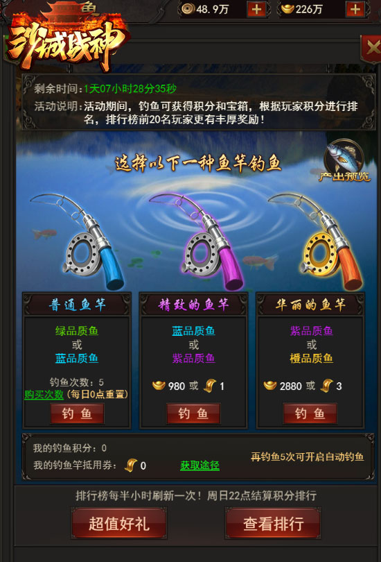 普通的鱼竿每天有免费次数,可花费元宝购买次数,每日0点重置次数。普通鱼竿可钓绿、蓝品质的鱼,精致的鱼竿可钓蓝、紫品质的鱼,华丽的鱼竿可钓紫、橙品质的鱼。