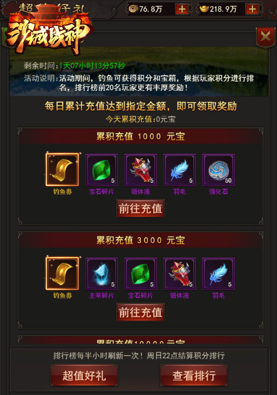 钓鱼活动期间内,充值达到指定额度的玩家,也可领取额外奖励。
