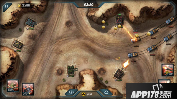 进入战斗:地图有4个入口,其中地图右边是两个金币装甲车进入的入口,左边则为出口。玩家需要尽快击杀进入坦克射程的金币装甲车以获得更多的金币,未击杀的车将从左侧逃逸。