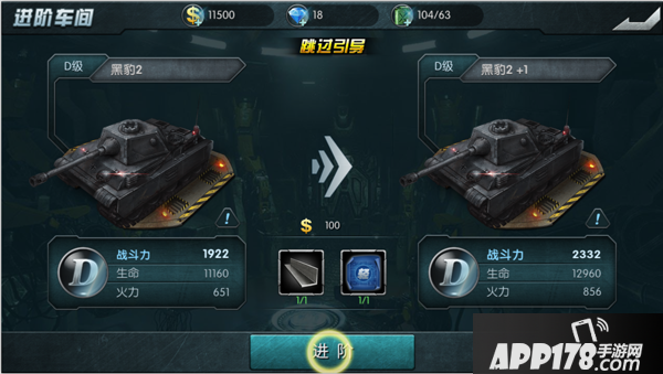 前期使用的第一辆坦克为“征服者”坦克,在第一关承受了大量的伤害,虽然有惊无险,但是接下来的关卡会越来越难,所以需要升级坦克,使其能挑战更强的轴心国坦克。需要对坦克进行进阶升级,新手提示会进入该界面。(前期的进阶材料比较好打,可以反复的刷对应的关卡获得进阶材料,新手进阶坦克后,战力会大幅上升,能更容易的通关普通副本,抗住英雄关卡的打击,获得更高星级的坦克碎片),前期建议优先进阶重型坦克(只有你的防坦够硬才能三星过关)。