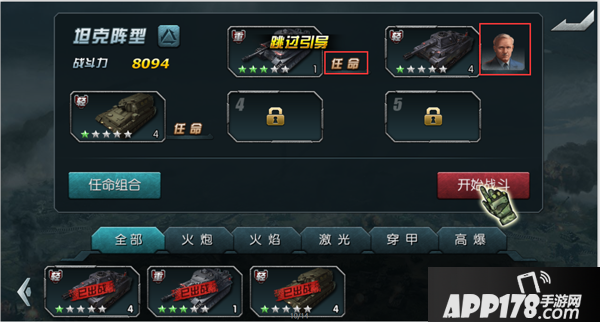 进入战斗指引,选择第一个关卡,选择好坦克,任命一位指挥官。