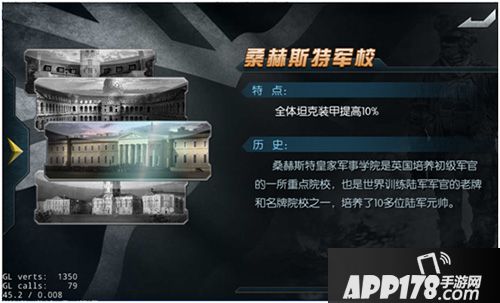 桑赫斯特皇家军事学院是英国培养初级军官的一所重点院校,也是世界训练陆军军官的名牌院校。桑赫斯特军校能够给予全体坦克装甲提高10%的属性加成,使我方坦克装甲更加厚实。建议准备收集防御型坦克的玩家选择桑赫斯特军校。
