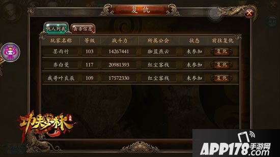 进入《功夫少林》野外副本之前,可以领取一个小时免费的回复BUFF和属性BUFF,回复BUFF每10秒回复5%的生命值,属性BUFF增加5%的攻,防,血属性。有这两个增益护体,我们基本在这一个小时内可以无伤可小怪们作战,如果遇到敌人攻击那另当别论。另外玩家可以在右下角点击“复仇”按钮,查看击杀信息和被击杀信息,并可以一键点击“复仇”开始对战!