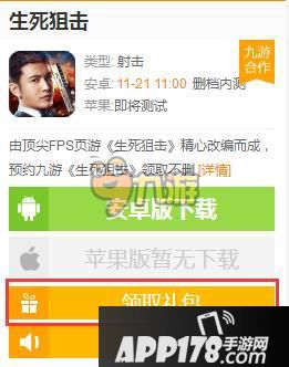 在APP178手游生死狙击手游专区右边有【领取礼包】的框框显示,玩家点击进去就可以看到为大家准备了福利礼包以及激活码了!