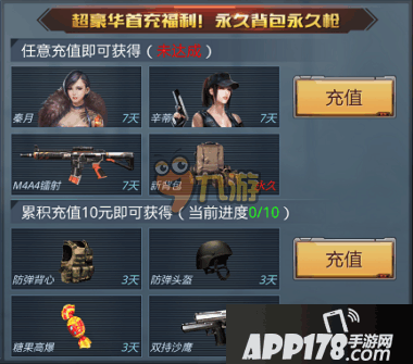 充值满10元可获得防弹套装(3天)、糖果高爆(3天)、双持沙鹰(永久)