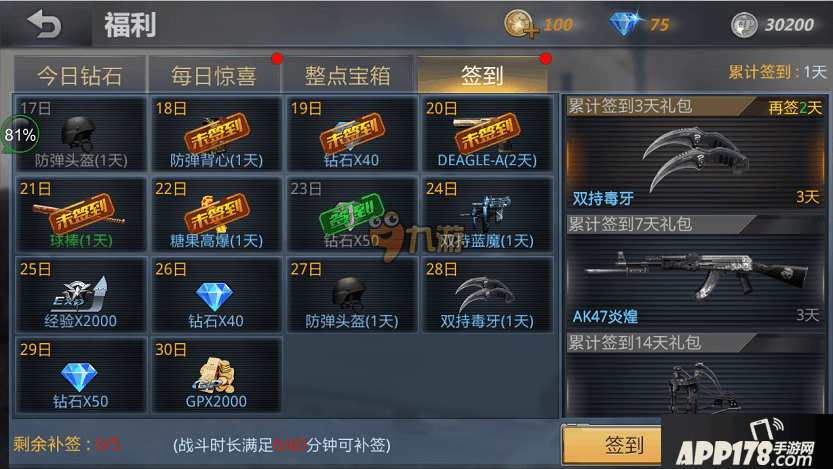 累计签到3次、7次、14次、20次、30次额外热卖武器赠送。