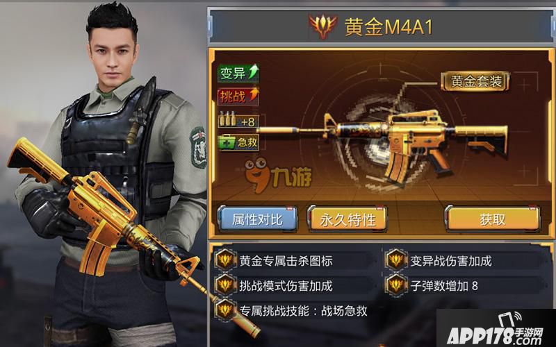 永久特性:黄金专属击杀图标、战场急救和挑战模式伤害加成。都是很实用的加成属性。可以说通过努力,获得黄金永久武器拥有黄金特权,是每一位玩家的梦想!