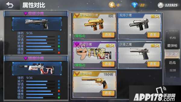 首先是和我们的另一把卓越级别的副武器猎魔沙鹰的对比图。从外形来看,两把枪给有千秋,都非常不错。从武器的属性来看,两把枪也是差距不大,荣耀沙鹰稳定不如猎魔沙鹰,猎魔沙鹰的精准不如荣耀沙鹰,但是如果从精准和稳定中挑选一个,启辰一定会挑选精准,毕竟精准是非常重要的,精准不行,就算你的威力在大,射速再快,打不到人也是不行的。所以来说精准是比较有用的。而且猎魔沙鹰和端游中的不一样,不能开镜,所以来说还是荣耀沙鹰比较好。而且从价格方面来说,也是荣耀沙鹰比较便宜的。所以启辰比较推荐荣耀沙鹰。