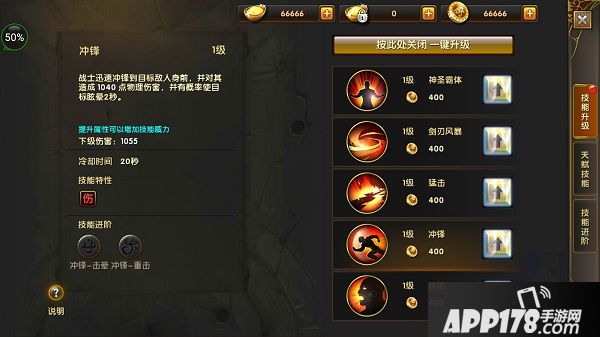 冲锋:战士迅速冲锋到目标敌人身前,并对其造成1040点物理伤害,并有概率使目标眩晕2秒。