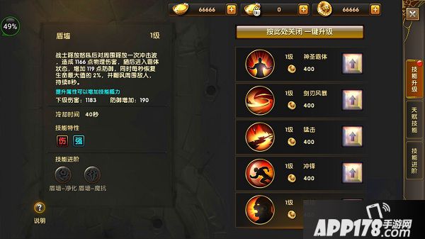 盾墙:战士释放怒吼后对周围释放一次冲击波,造成1166点物理伤害,随后进入霸体状态,增加119点防御,同时每秒恢复生命最大值的2%,并嘲讽周围敌人,持续8秒。