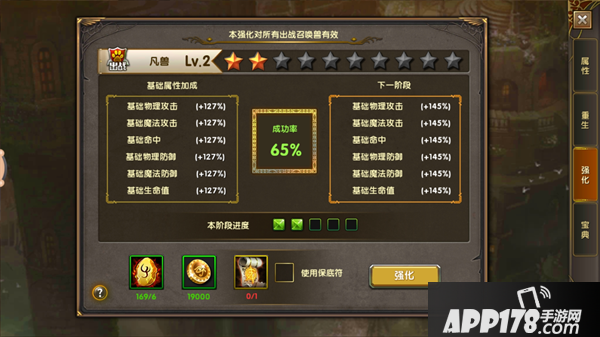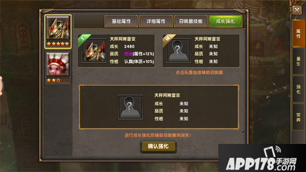 在主界面点击【召唤兽】按钮,并选择【强化】页签,即可进入召唤兽强化界面。召唤兽强化需要消耗召唤兽强化石。强化有一定成功率,如果强化失败将会倒退强化本阶段的进度,但不会倒退总强化等级。因此当强化成功率较低时,可以考虑使用强化保底符。