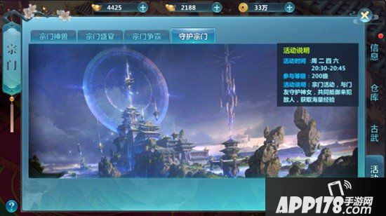 每周二、四、六三天都可以参加守护宗门活动。玩家跟宗门的道友一起守护,抵御进攻的敌人,只要获得胜利就可以获得海量经验,这样是玩家后期获得经验的主要来源。
