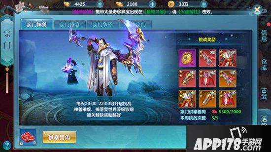 挑战宗门神兽可以获得极品装备,玩家每天的20点就可以开始挑战。挑战时间越短,玩家获得的奖励就越好,最好可以获得红色装备。