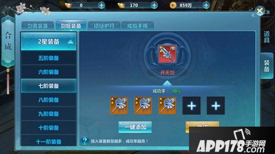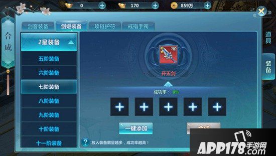 如果玩家不懂什么装备可以合成的话,可以使用一键添加,这样能够合成的装备就会自动添加。想要合成,至少需要三件装备才可以,装备数量越多成功率越高,就能够获得更好的红色装备。