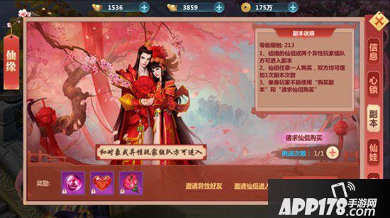 玩家每天只有一次进入仙缘副本的机会,但是可以通过购买次数增加仙缘副本次数。不过单身玩家只能各自购买自己的次数,而夫妻是可以其中一人购买就可以。