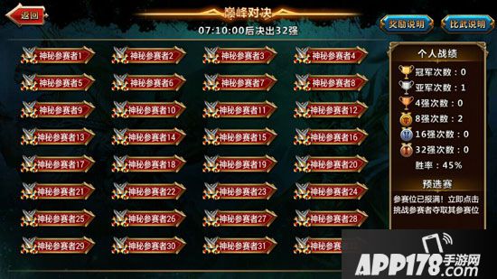 但不要以为自己抢到了最先报名的32个名额就可以高枕无忧了。在淘汰赛开始之前,其他玩家都可以挑战这32人,击败他们中的任意一人,就能获得被击败者的参赛资格。所以想要参加巅峰对决,不仅手要快,战力也要足够强大。