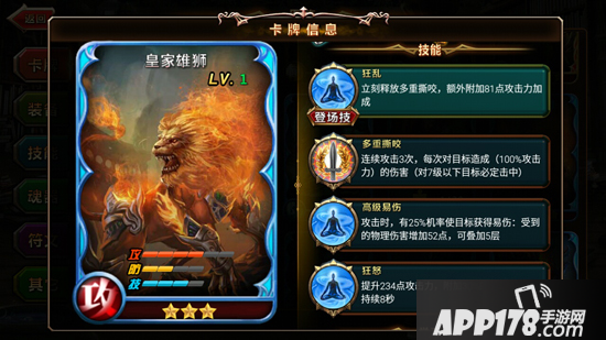 皇家雄师属于至高天堂,拥有多重撕咬、高级易伤、狂怒三个技能;其中多重撕咬可连续攻击多次,每次对目标造成全力攻击力的伤害;高级易伤技能可多次叠加增加敌方受到的物理伤害致使目标获得易伤;狂怒是他提升攻击力,并附加吸血效果;所以说,在混战状态之中,皇家雄师借其突出的攻击技能具有很大优势。