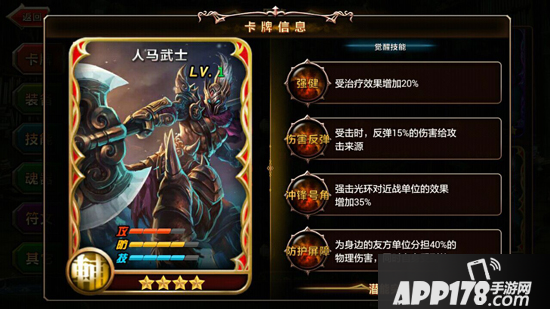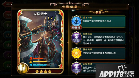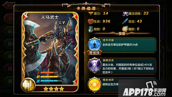 从技能上看,人马武士进可攻退可守。登场技就能够直接为己方全体单位提升护甲。而裂地震击技能在造成伤害的同时能够将敌人击退,沉默魔法则能够使区域范围内的敌人进入持续沉默状态。强击光环提升附近友方攻击力的效果则使人马武士有了成为阵型核心的资本。