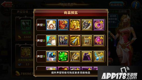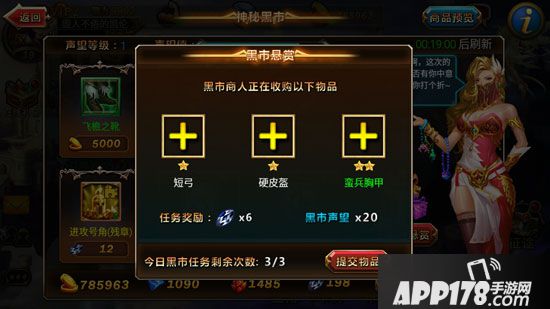 想要在《神魔之战》中获得神秘宝库的独有货币黑曜石,并提升自己在黑市中的声望等级,玩家需要完成黑市悬赏的任务。该任务要求玩家上缴对应的装备,在收集齐完成上交后,玩家将获得少量黑曜石与黑市声望。黑市声望越高,玩家可购买的商品就越多。所以想要在黑市商店中获得自己想要的英雄与装备,玩家一定要完成全部的黑市悬赏任务。