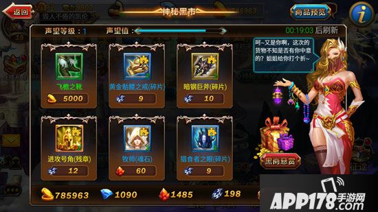 将《神魔之战》的主界面滑至右侧就能够看到神秘宝库的入口。在神秘宝库中玩家可以消耗金币、钻石、魂晶与黑曜石来购买自己想要的英雄碎片,高级的符文碎片与高级的装备碎片。如果不满意当前神秘宝库黑市贩卖的物品,玩家可以点击右下角的刷新按钮换一批物品。VIP等级高的玩家每天能够获得免费刷新的机会,超出刷新上限之后,玩家就需要用晶钻来刷新了。