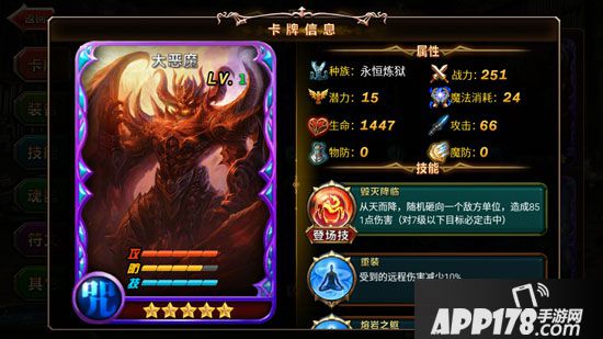 大恶魔是《神魔之战》中永恒炼狱的招牌英雄。大恶魔的整体三围比较平均,防御稍微弱一点。但作为咒系英雄的大恶魔是名副其实的法师克星,除了登场技突袭后排之外,觉醒之后还能够将敌方远程英雄拉到身边。大恶魔的获得玩家也需要费一番功夫,玩家可以从精英关卡和“守望高地”秘境大恶魔boss处搜集碎片进行兑换。