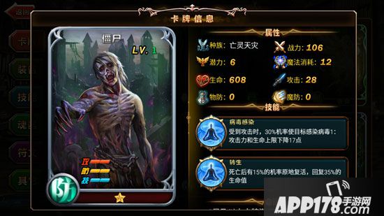 僵尸的全属性平均并且没有太多的长处。两个技能是病毒感染和转生。病毒感染可以让僵尸在受到攻击时有一定的几率降低伤害来源的攻击力和生命上限。转生技能则能够让僵尸在死亡后有一定的几率原地复活,回复部分生命值。