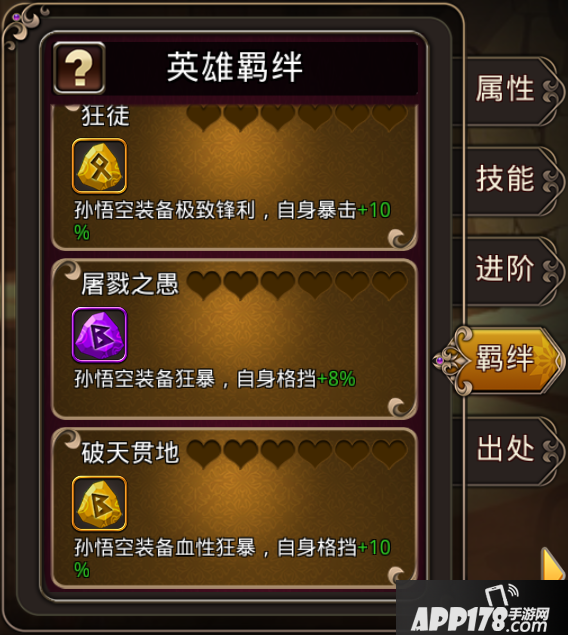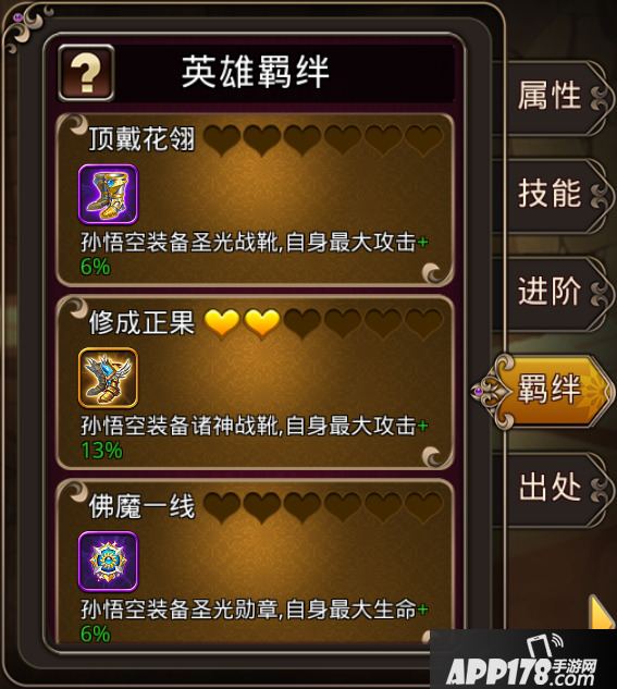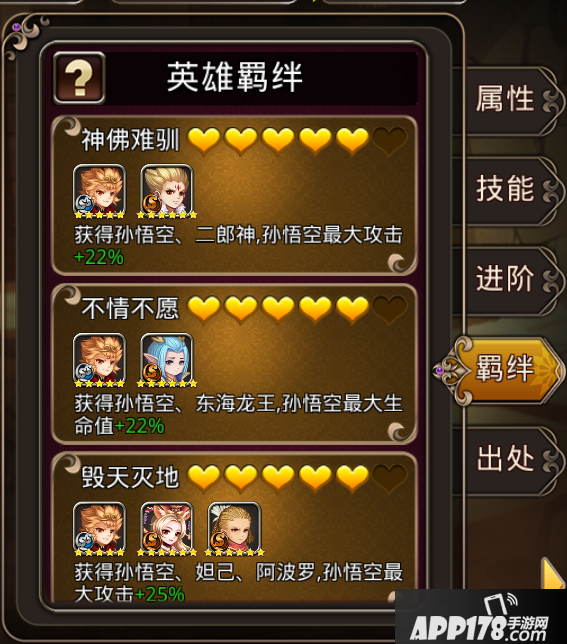 羁绊星级:构成羁绊的全体英雄同时达到一定星级,则羁绊星级提升。例如:孙悟空五星,二郎神六星,则羁绊取星级较小的孙悟空,为五星羁绊。