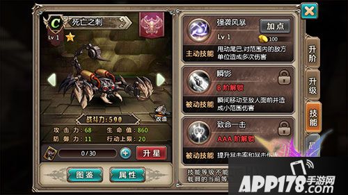死亡之刺共有三个技能,初始技能强袭风暴将甩动尾巴,对范围内的敌方单位造成多次伤害。升到B阶将解锁瞬影,可以瞬间移动到敌人面前并造成小范围伤害。升至AAA阶将解锁技能致命一击,可以提高暴击率和暴击伤害。