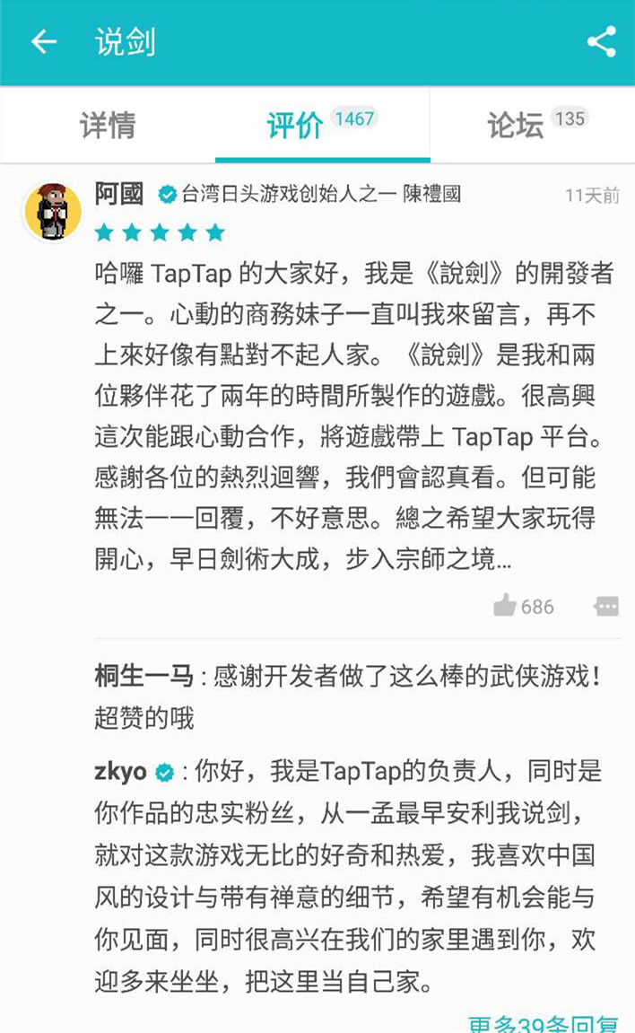 越来越多高素质的玩家涌进TapTap,越来越多的开发者入驻TapTap,《说剑》的制作者阿国在评论区与玩家积极互动,反响强烈,玩家提出了很多意见和想法,阿国认真倾听。在中国,开发者一般在自家的论坛或者从客服那边得到玩家的反馈,很少有像TapTap这样的平台,把游戏和开发者聚合在一起,形成游戏、开发者、玩家三者良性互动,拉近开发者和玩家的距离,从而让开发者根据玩家最直接的反馈做出符合玩家需求的游戏。