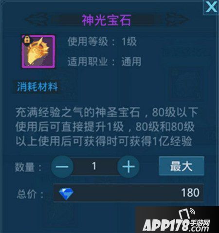 神光宝石同样是个好东西,在角色80级以下时使用可以直接提升一级,80级以上使用可以一次性获得一亿经验!所以建议大家如果79卡等级了可以使用,如果可以不卡级一定要80以后再使用,性价比最高!