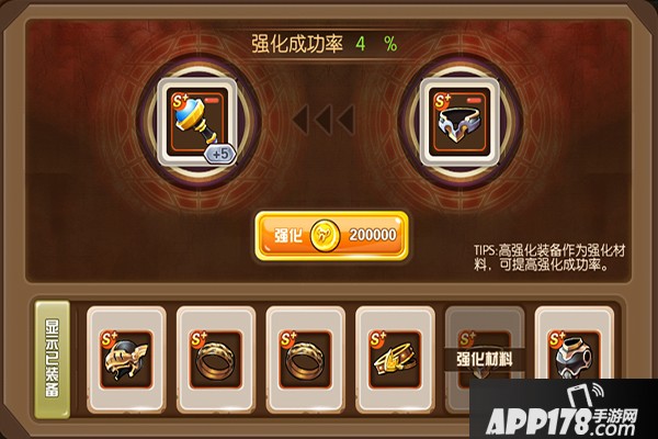 进入强化界面后,我们发现强化装备和被强化装备需为橙色才可以,也就是说S级以上的装备方具备强化条件。强化一件橙色装备需要另一件橙色装备,随着强化等级的提高,强化成功率也就越低。小编现在的武器是+5强化,再要强化到+6的成功率只有4%,但是小编注意到了一点,不知道守护者们有没有注意到了?那就是强化装备自己如果有强化等级的话,是可以提高强化成功率的,也就是说,小编现在+5的武器想要强化到+6,用一件+4的装备来强化,成功率会大大提升呦!