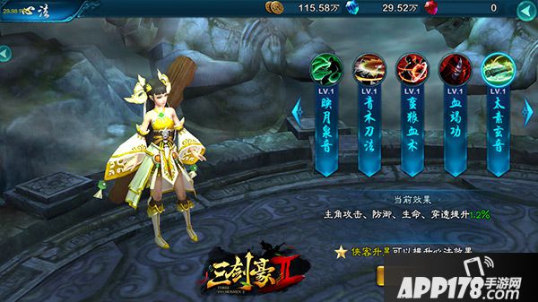 主角攻击、防御、生命、穿透提升1.2%。(心法效果随侠客星级提升)