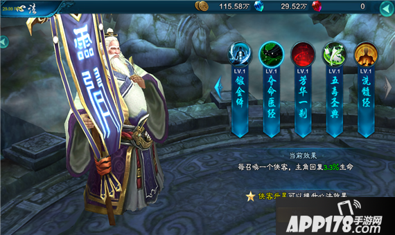 每召唤一个侠客,主角回复3.3%生命(心法效果随侠客星级提升)