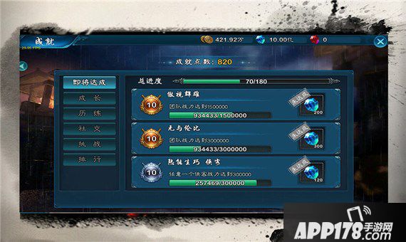 目前共设有180个成就,分为几种不同类型的大项,包括战力成长、副本进度、挑战与竞技等。