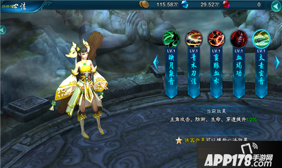 主角攻击、防御、生命、穿透提升1.2%。(心法效果随侠客星级提升)