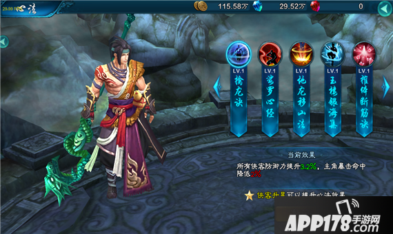 所有侠客防御力提升3.2%,主角暴击命中降低2%(心法效果随侠客星级提升)