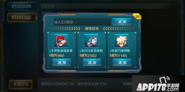 我们在游戏的战斗过程中,总是会遇到不少志同道合的朋友,在这个时候我们就可以交换昵称或者是ID,当然还是ID比较好,可以避免打错字等问题哦。然后在交友界面上的左下角,点击添加好友就可以进入添加好友界面,输入ID就可以自由添加了。