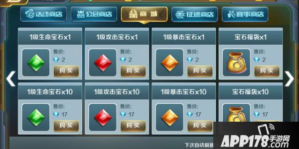 了解了这些宝石的属性,那么接下来就说一说宝石的来源。我们的宝石主要通过公会商店兑换和商城中的购买来获得。快速获取的方法,只需要花费钻石,就可以购买到所想要的宝石。不过商城只提供一级宝石,如果想要高级的,还需要自己去合成。另外商店不是只有钻石可购买,公会积分、赛事勋章、征途兑换券也可兑换。