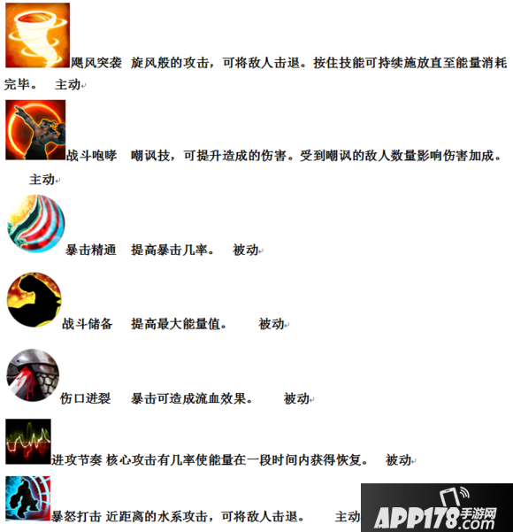 泰拉的另一个转职方向叫做复仇斗士,感觉类似于一般端游里面的狂战士,这个职业总结为一句话就是:“不要怂就是干!”让你的怒火燃烧对手!近战能力十分强悍,既有突进型技能还有AOE伤害技能和一些近战BUFF攻击、防御、暴击的技能。以下是复仇斗士的技能效果说明: